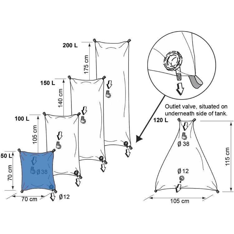 The Plastimo flexible, portable, water bladder, includes tie down loops on the corners and all water bladders have a 38mm (1 1/2 inch) hose inlet fitting on the upper side of the tank and a 12mm (1/2 inch) hose outlet fitting on the underside. The only exception is the 120 litre bow tank style where both fittings are located on the upper side.